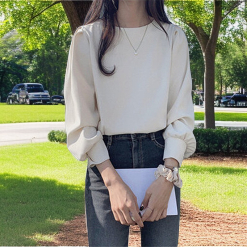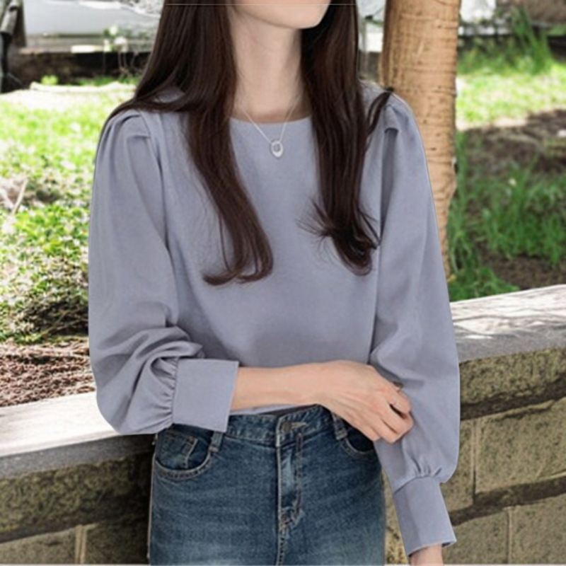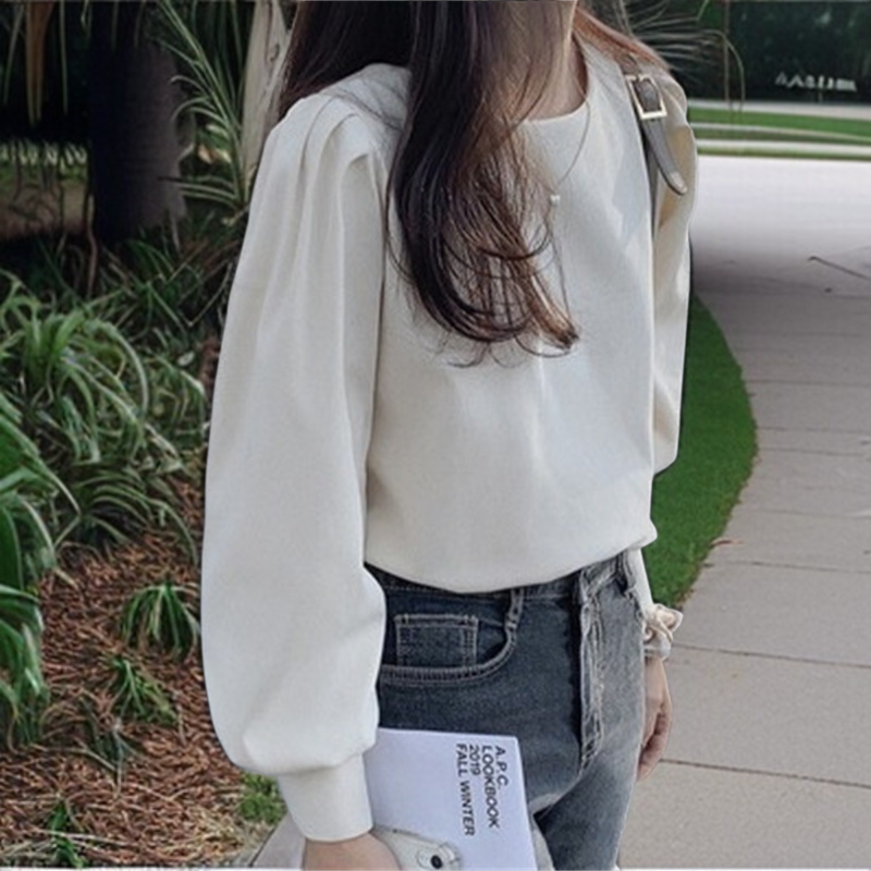 女性の秋の白い老化長袖シャツ緩い泡袖ブラウスヘイズブルー長袖シャツ